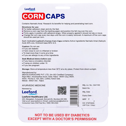 Mostly caused by poorly fitted footwear putting extra pressure on a particular area of the foot, corns are immensely painful. They can be hard corns or soft corns formed either on the top or sides of the foot. But whatever variant they may appear in, Leeford has the best corn caps online to save your day. Enriched with a measured dose of Salicylic acid paste, these corn caps loosen the skin to remove the corns in the most painless way.