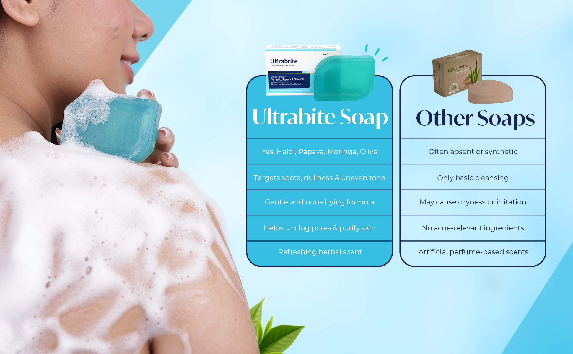 Ultrabrite Soap Ultrabrite soap contains Curcumin, that reduces redness, swelling reduce.