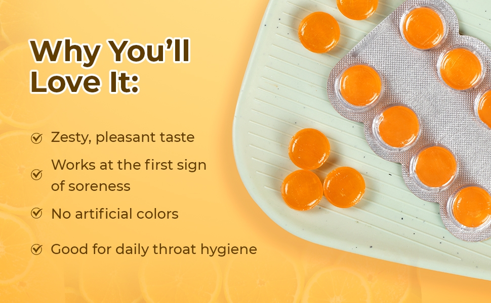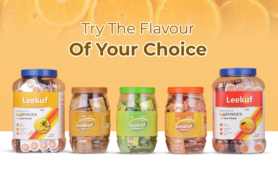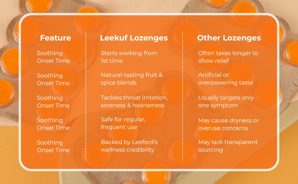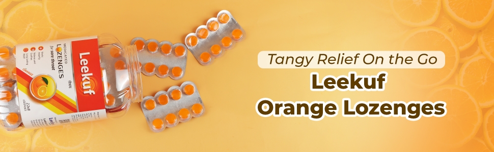 Leekuf Lozenges are an Ayurvedic formulation that dissolves quickly, helping soothe cough and sore throat effectively. These orange-flavoured lozenges provide a soothing sensation to irritated throats. Enriched with Ayurvedic ingredients such as menthol, honey, kali mirch, and herbal extracts, they help relieve mouth irritation, dryness, and congestion naturally. They are an ideal option for those who find swallowing pills difficult, including children and older adults. The lozenges slowly dissolve in the mouth with saliva, making them easy and convenient to take. With a quick onset of action, they provide instant relief from sore throat and irritation, helping you feel comfortable and refreshed in minutes.